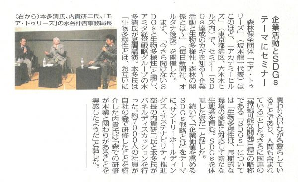 毎日新聞に「SDGs達成のカギを知る~企業活動と生物多様性・森林の関係とは~」セミナーの様子が掲載されました