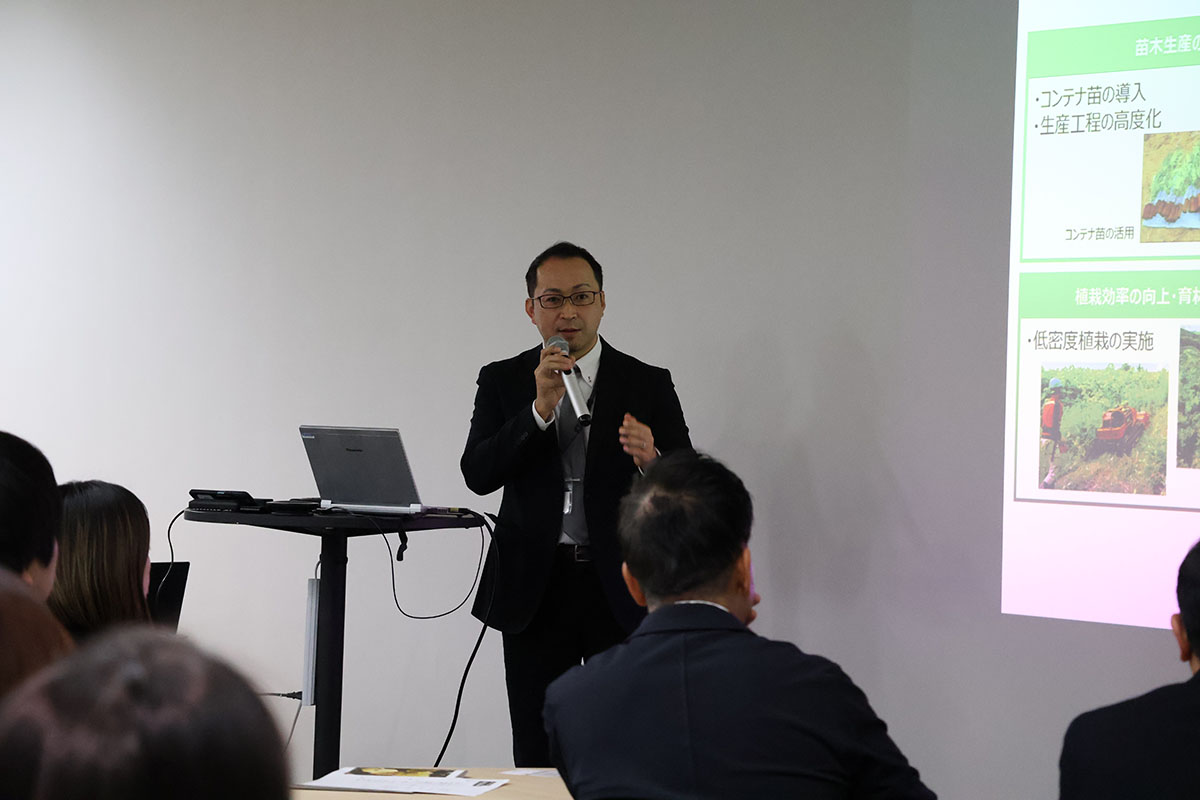 ▲つづいて林野庁 森林利用課 山村振興緑化推進室 課長補佐 藤原智史様より講演いただきました。1)前半は「森林・林業の現状と課題」ということで、水源涵養、災害防止、CO2吸収といった多面的機能に代表される森林の高い価値や、「伐って使って植えて育てる」循環によって営まれてきた林業の基礎知識をご説明いただくとともに、林業従事者の高齢化や担い手不足、林業全体の所得水準の低さ、木材価格の低迷、伐採後の再造林放棄地の問題などさまざまな課題が共有されました。課題がある一方、明るい話題も。CLT(Cross Laminated Timber)という新たな技術の登場により、これまでにないかたちで都市部での木材利用が広がっている事例のご紹介では、企業の木材利用の可能性を示していただきました。
