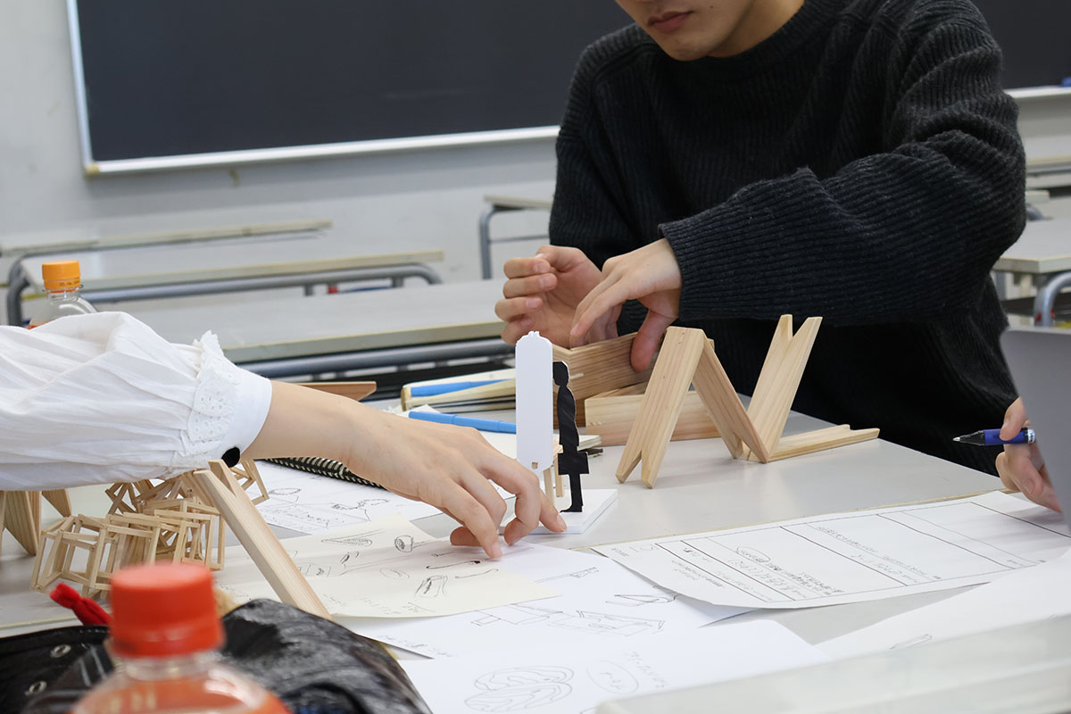 ▲学生さんが手に取っているのはケヤキの葉と種。水谷・青木に桑沢デザイン研究所でのゲスト講師をご依頼くださっている温野まきさん(桑沢デザイン研究所の卒業生であり非常勤講師)が、学校からほど近い表参道で拾ってきたものです。かつて約200本あったと言われる表参道のケヤキは東京大空襲で大半が焼失し、13本だけが戦火を生き延びました。いまもそのうちの何本かは表参道に残っています。「ビル7階ほどの大きさになるプログラムが、こんなちっちゃい種の中に入っているんですよね」(温野)。大地に根を張り、困難な時代を潜り抜けた太い幹から大空へ向かって枝葉を広げているケヤキのように、学生のみなさんのアイディアの種が未来へ向かって芽吹き、デザインの力で大きく育っていくことが楽しみです。