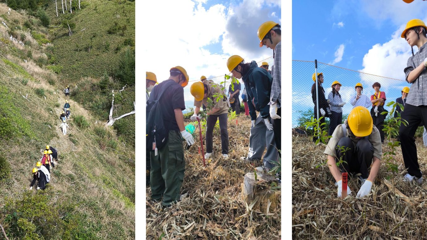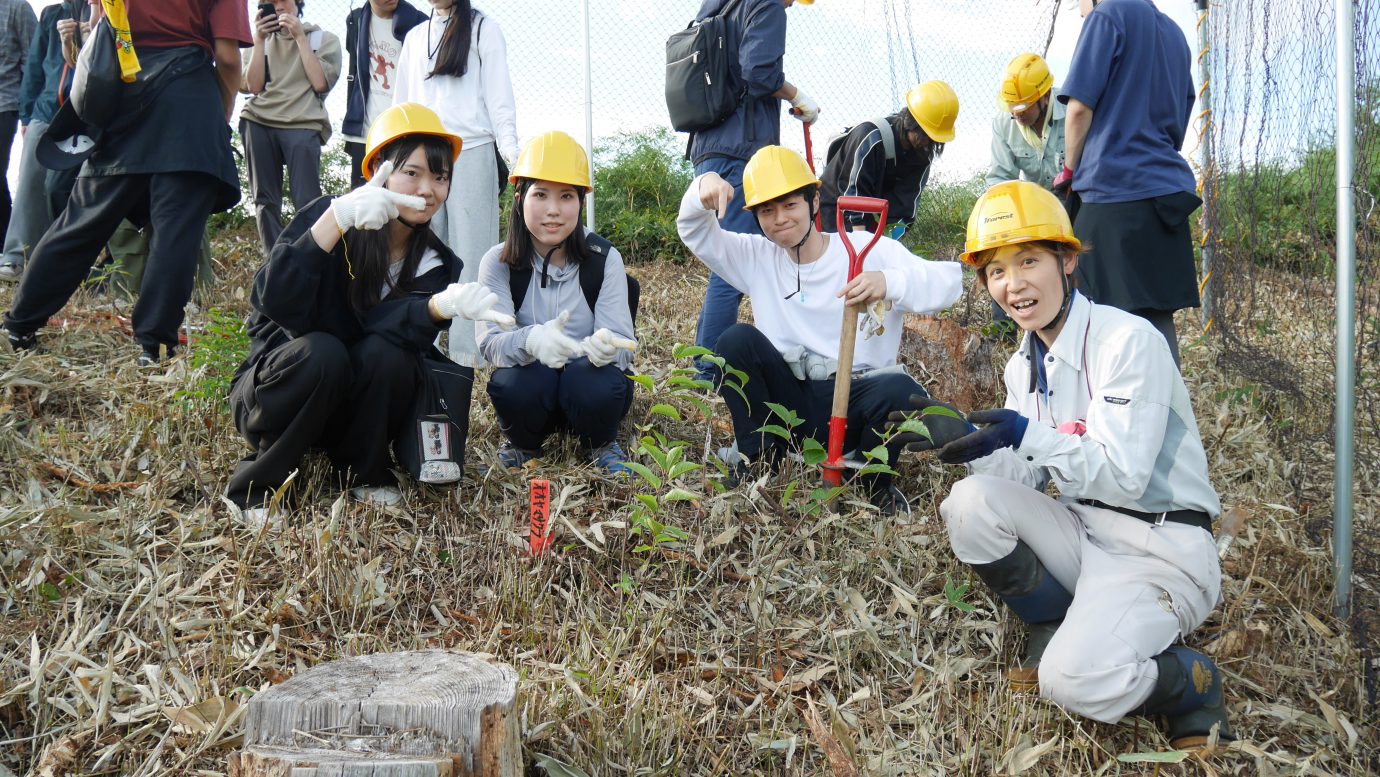 天然林から植林地へ戻り、学生たちは一人一本ずつ苗木を植えました。その中には「なえうぇる」で育てたコナラとクリが3本ずつ含まれていました。2年ほどかけて種から育てた苗木がこれから何十年もかけて大きく育っていく。都会では感じにくくなってしまった“森の時間”に触れる植林体験となりました。