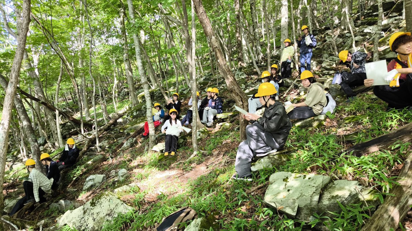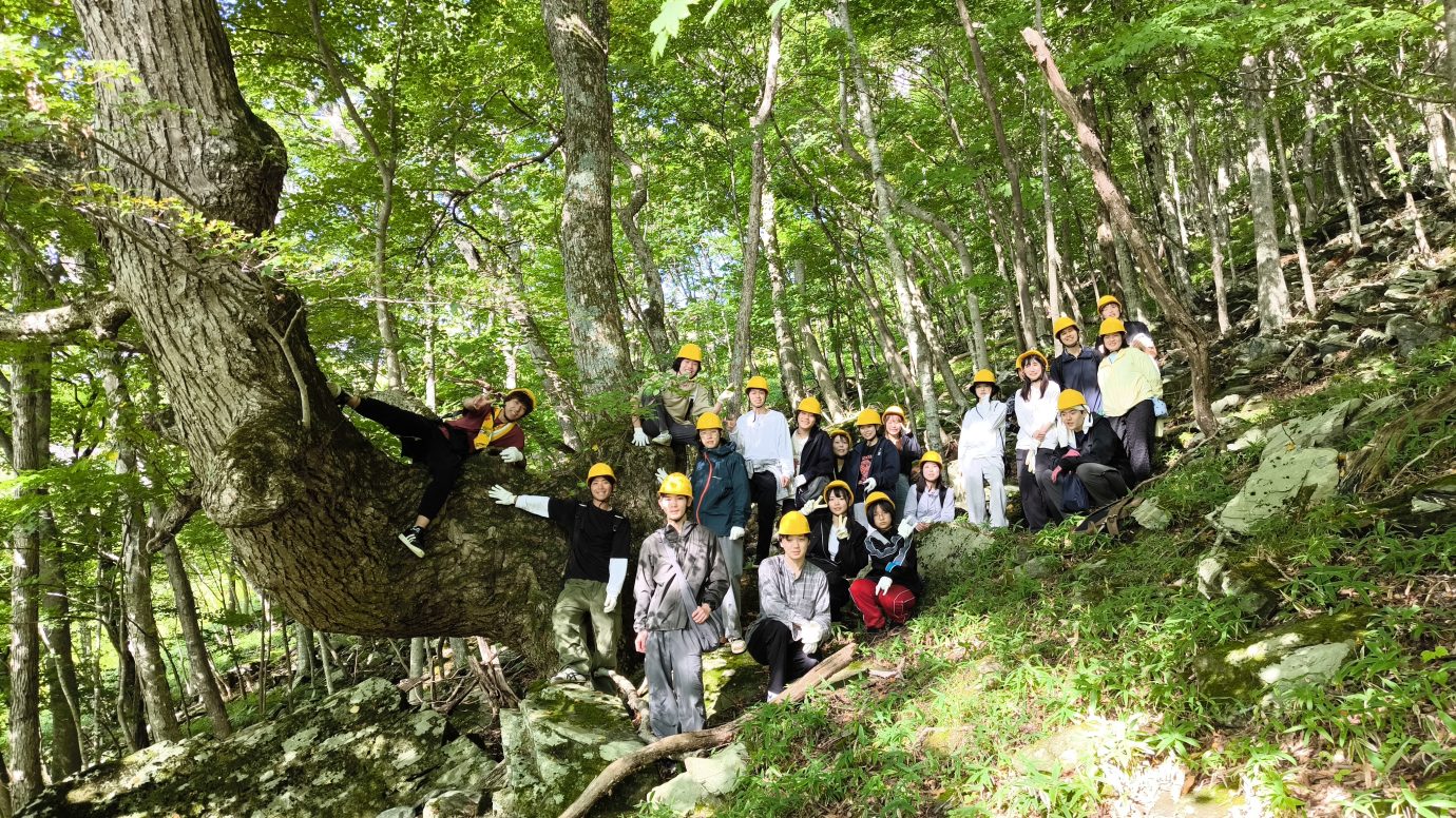 足元がぐらつくような山道を、時折手をつきながら歩く学生たち。途中すこし弱音を吐く声も聞こえてきましたが無事に全員が天然林へ到着しました。呼吸を整えたあと、五感いっぱいに森を感じる時間を持ちました。都会の喧騒から離れ、針葉樹の多い人工林とも異なる広葉樹の森ならではの匂いや音、明るさを全身で感じとります。その後、日本や世界の森林が抱える課題について共有し、経済合理性だけを求めない広葉樹の森づくりの意義や可能性について意見を交わしました。