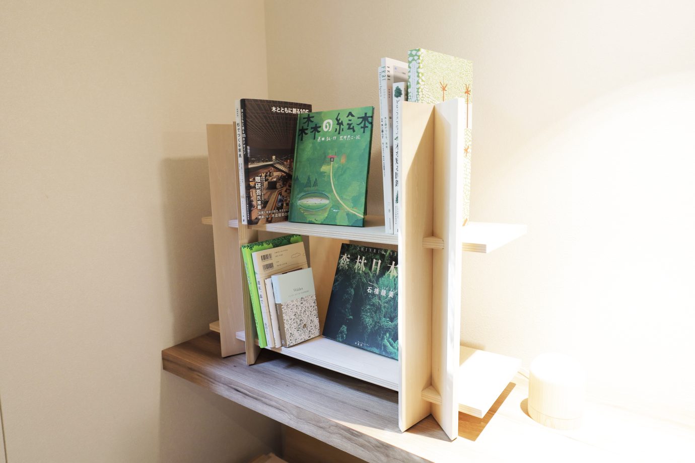 ▲もっと身近に木を感じていただけるように、木に関する雑誌や絵本、写真集を集めました。知っているようで、実は知らない木に関する意外な事実を学べる本棚です。