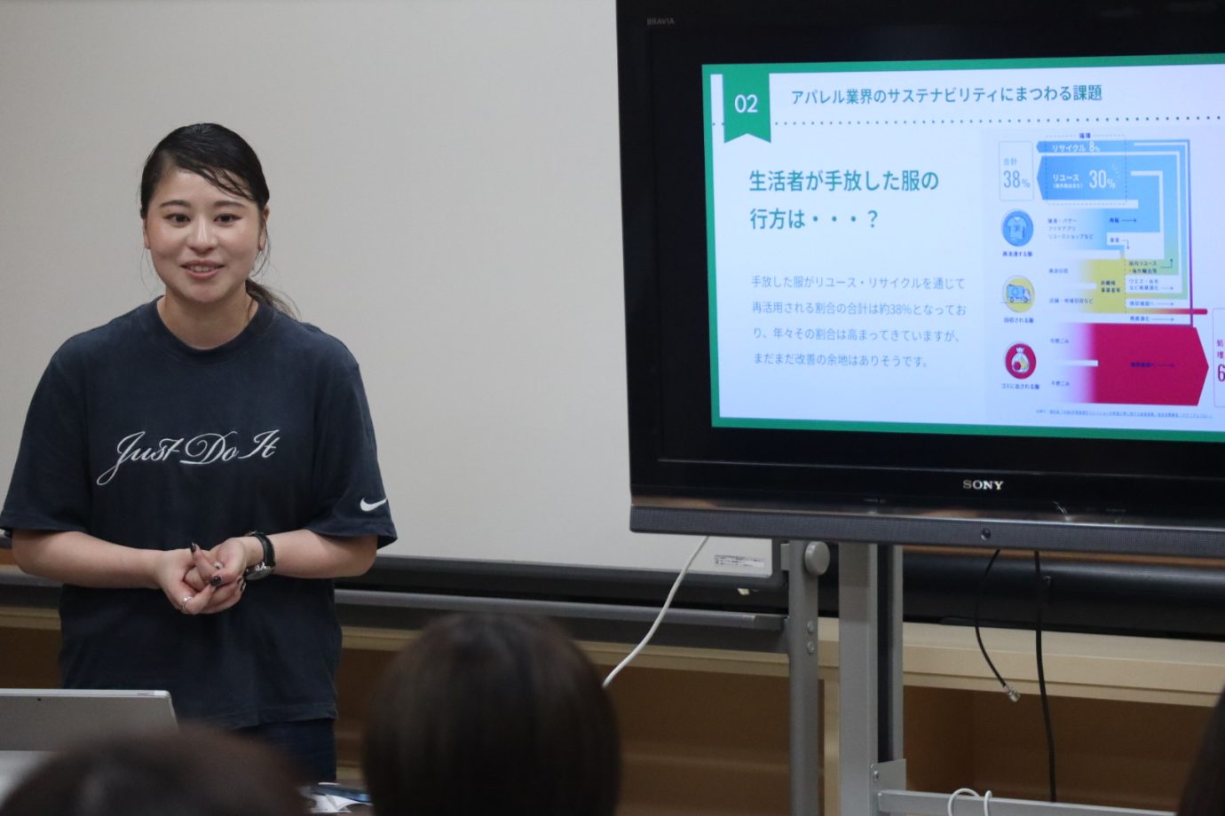 梼原町に到着した学生たちは、まず青山商事 人材開発部からオープンカンパニーの趣旨について説明を受けました。アパレル業界は主要産業の中でも特に環境負荷が高いとされますが、青山商事は1998年から下取りサービスによる不要衣類の回収をはじめ、協力企業と共にリサイクル・リユースを通じた資源循環を推進してきました。その歩みについて耳を傾ける学生たちの姿からは、収益だけでなく環境や社会への企業の姿勢に関心を寄せる、環境教育を受けて育った世代ならではの意識が感じられました。