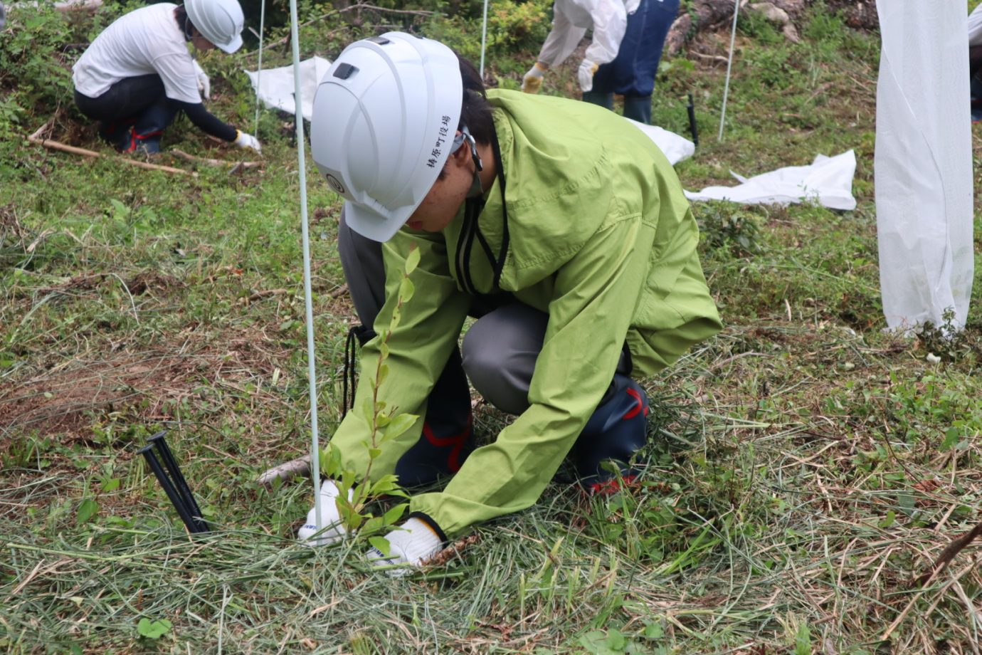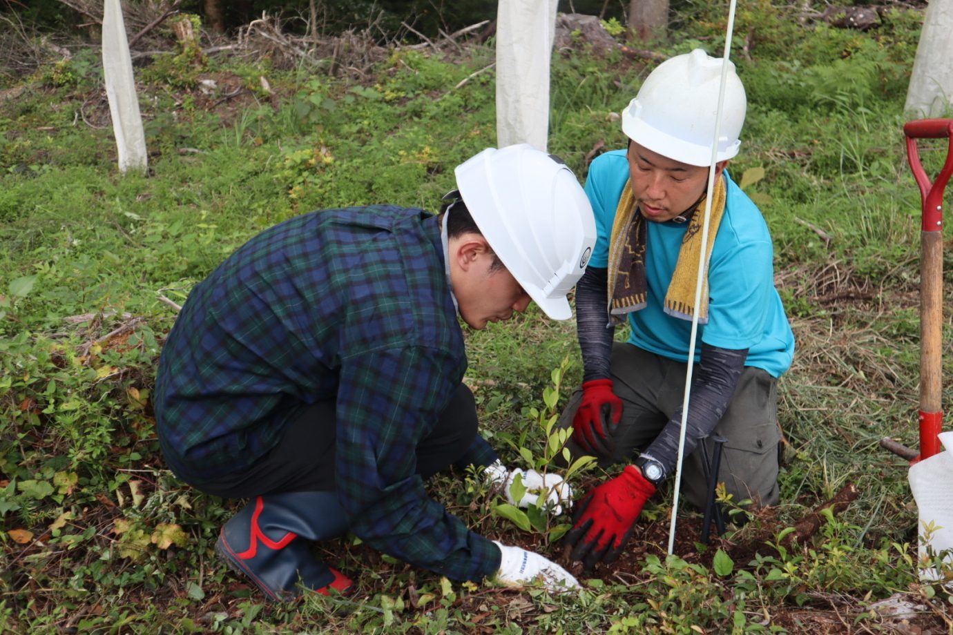 座学の後は、仲洞地区の「AOYAMAの森」へ。現地で施業を担う株式会社KIRecub代表・下村智也さんの指導のもと、植樹を行いました。植えたのは梼原町の町名の由来となったイスノキで、1人2本ずつ。9名全員が人生初めての植樹体験でした。