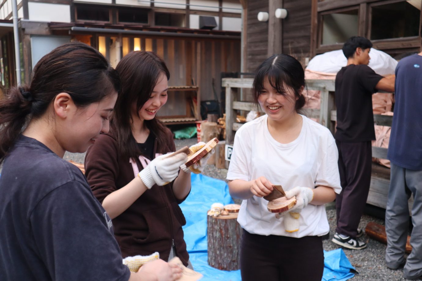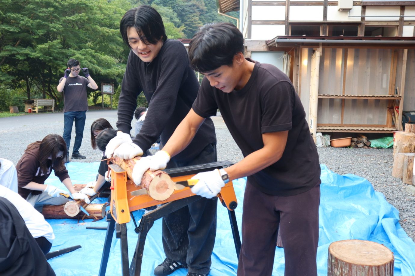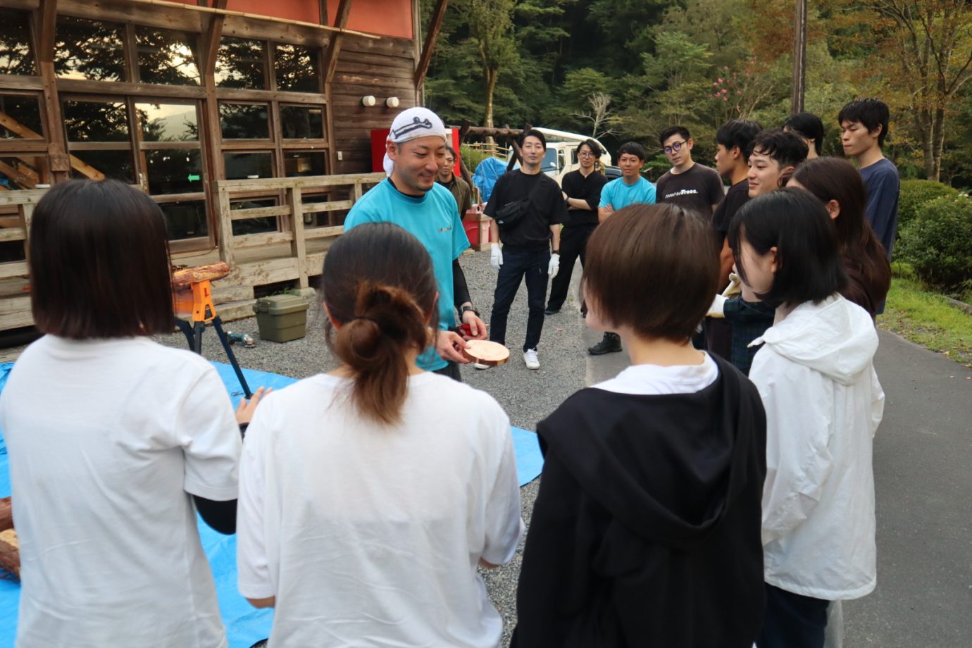 植林地から太郎川公園へ場所を変え、ヒノキのコースターづくりに挑戦しました。指導いただいたのはKIRecub木製品事業部担当の長谷川夏輝さん。ヒノキの丸太からの切り出し、やすりがけ、そしてレーザー加工まで一連の木材加工プロセスを体験しました。