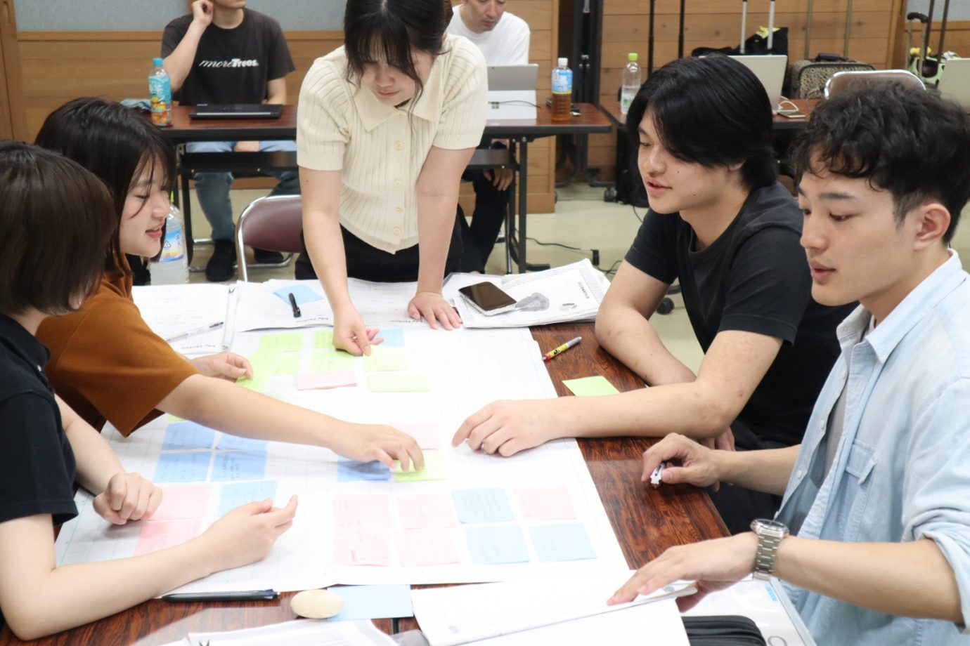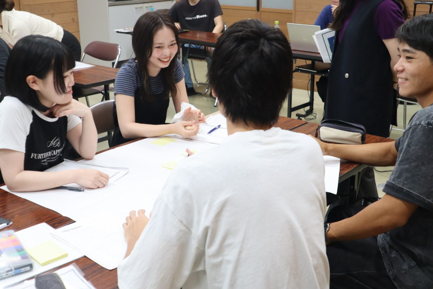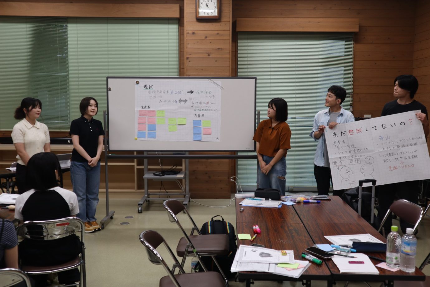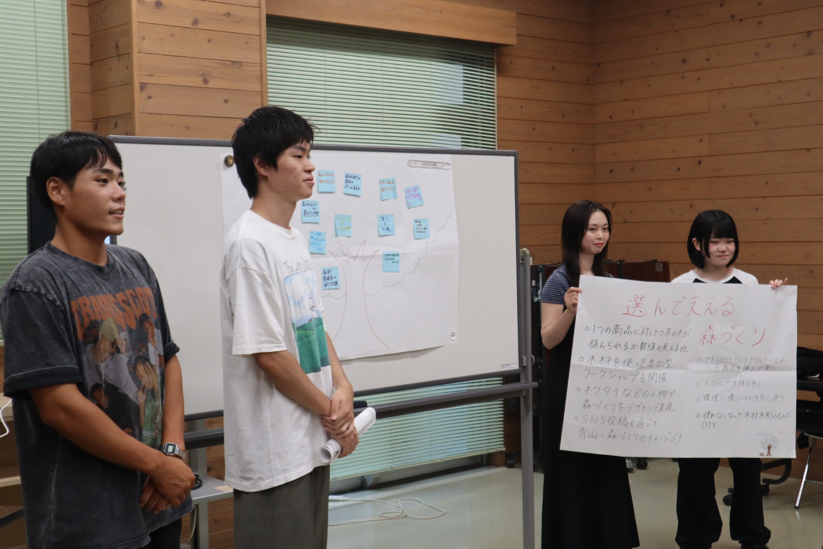 2日目は、「青山商事でやりたいこと」「今の自分たちにできること」の2つをテーマにしたグループワークに取り組みました。初日に学んだことを振り返りながらグループのメンバーと対話し、アイディアを出し、最後は発表へ。学生たちの真剣さが伝わる充実の発表内容でした。また、梼原町森林(もり)づくり脱炭素推進課課長の上田真悟さんにもご同席いただき、林業の課題や今後の可能性について座談会形式で意見交換を行いました。
