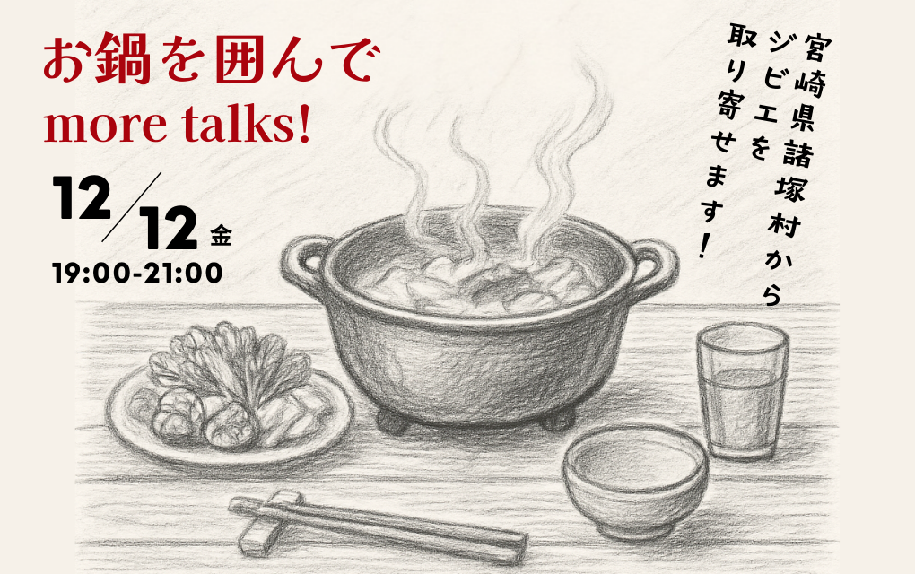寒くなってきたので今回はみんなで「お鍋」を囲みます。more treesの活動地のひとつ「宮崎県諸塚村」からジビエを取り寄せてホクホクと温まりながらのんびり語らいましょう。