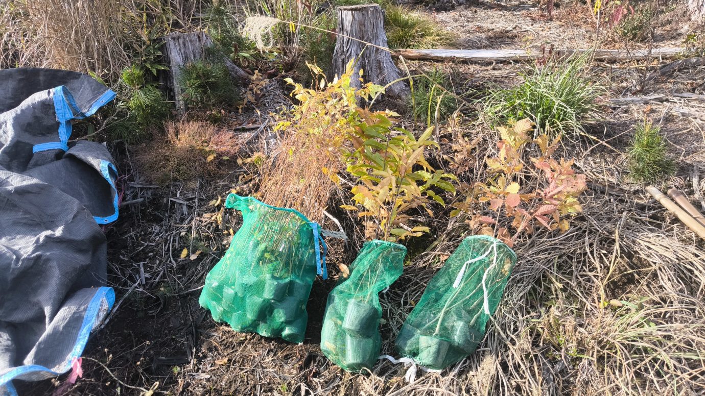 今回補植したのはミズメ30本、ミズナラ5本、クリ5本の計40本です。4人で40本というのは少々大変でしたが、手分けして作業を進めていくみなさん。笹の根が張っているところなど植えにくい場所が多かったものの無事にすべて植え終わりました。