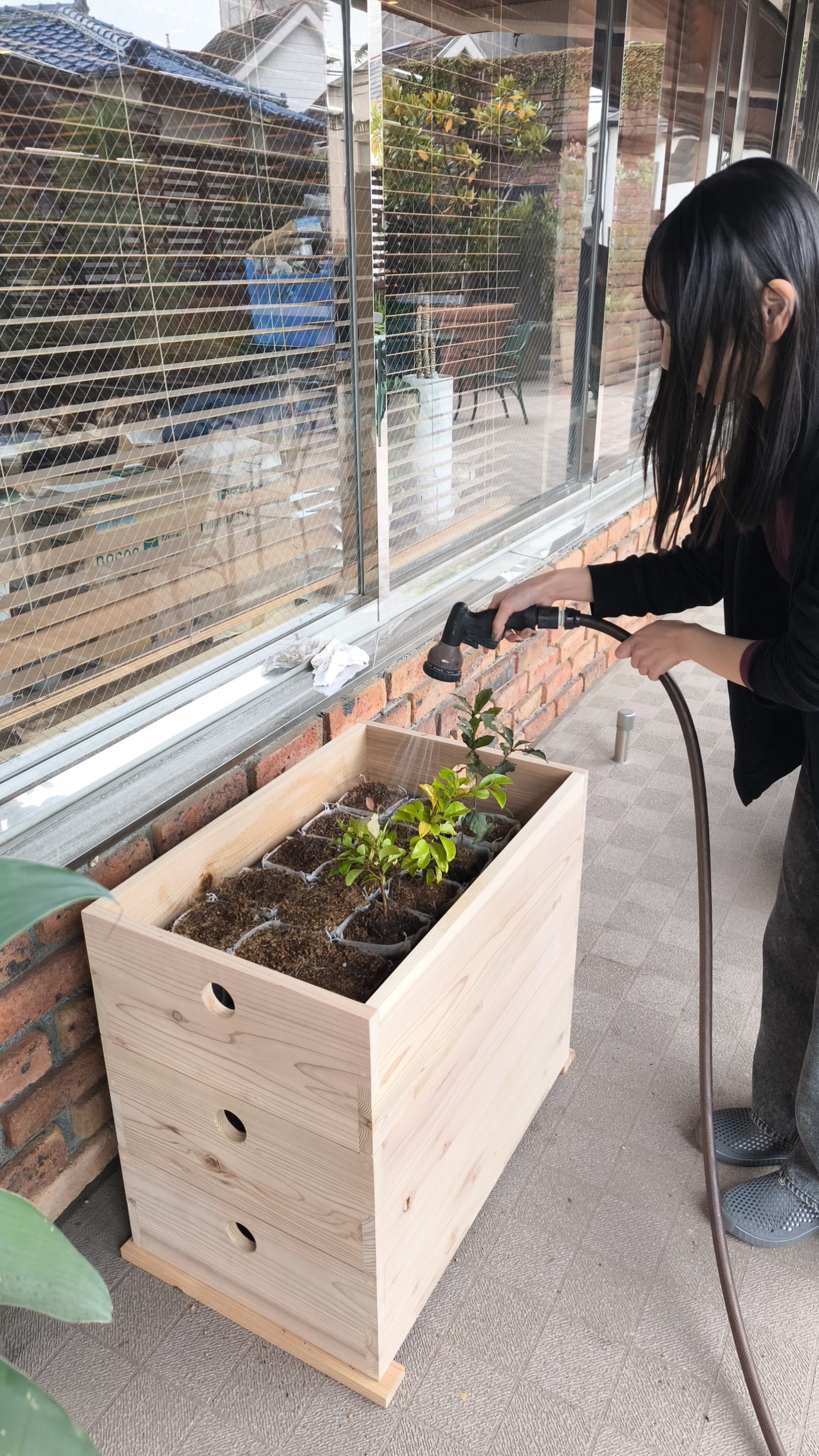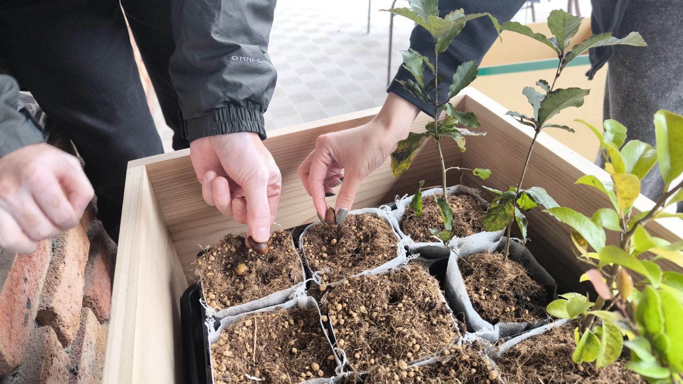 運ばれた苗木たちは、ホットスタッフのオフィスに導入された育苗キット「JUBAKO」という新居へ。空いているポットには梼原町で採ったどんぐりを蒔き、水やりをして、“HOT STUFFの森 in Tokyo”の幕が上がりました。
