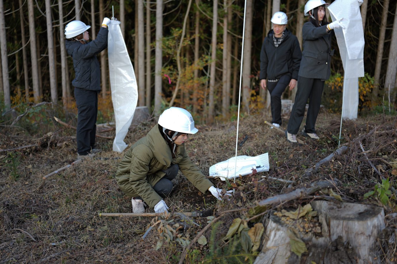 つづいてはホットスタッフのみなさんの出番。鍬を振って苗木を植えるための植穴を掘り、ひとり1本、コナラを植えます。野生動物から苗木を守るための保護ネットの取り付けも行いました。