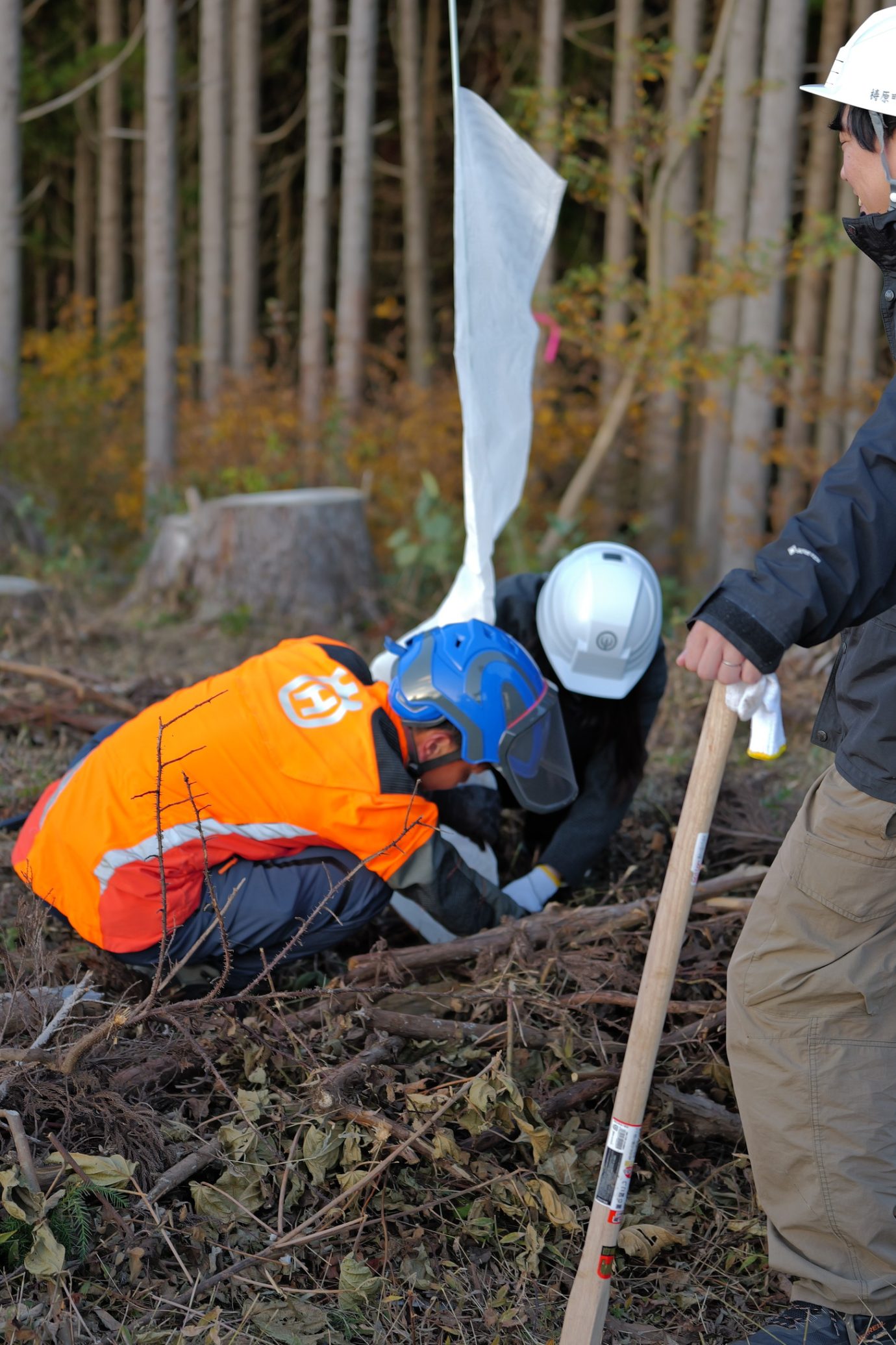 いまや森を守るために生まれてきたとしか思えない風姿の下村さんの手ほどきで、ホットスタッフのみなさんははじめての植樹の仕方を学んでいきます。