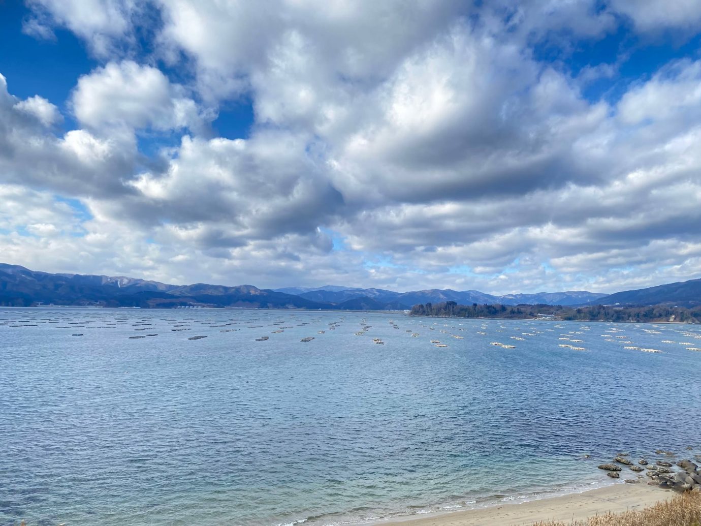 ▲カキ養殖の筏が浮かぶ広田湾