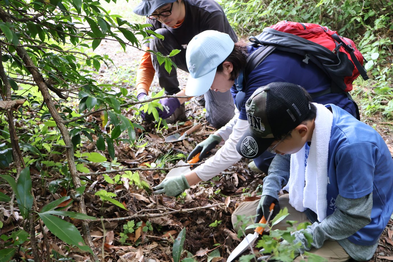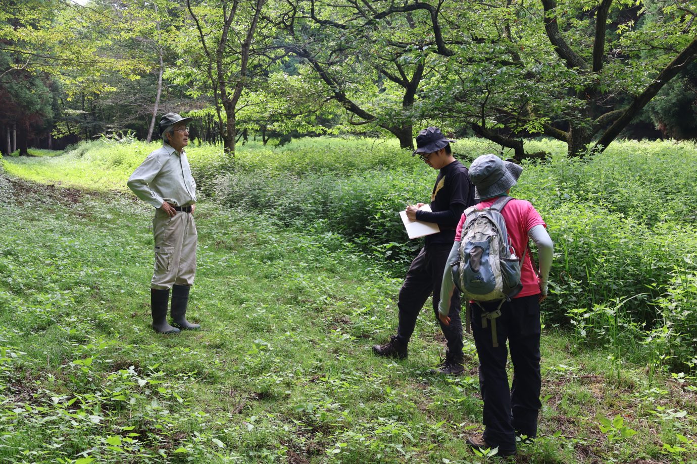▲森づくりパートナーの気仙地方森林組合・木下静恵さん(一番右)と樹木医・佐々木理史さん(右から2番目)とともに植樹した苗木の生育調査を行っている様子
