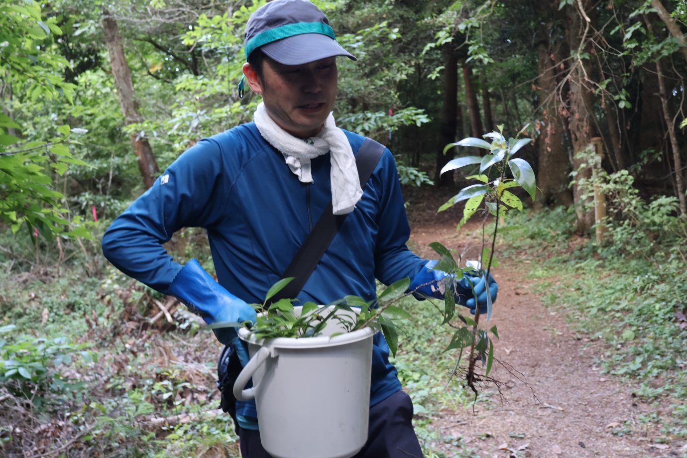 翌日には、釜石地方森林組合より地域に自生する広葉樹の種採りができる場所をご紹介いただき、気仙沼市の御崎神社では実際にタブノキの実生苗の山引きも行いました。
